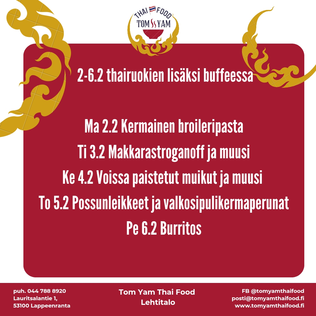Lounasbuffet tarjoaa laajan valikoiman herkullisia thairuokia sekä ajoittain lisäksi perinteisiä suomalaisia makuja. Buffetista voit myös ostaa juuri sen verran ruokaa kilohinnalla mukaan kuin haluat.